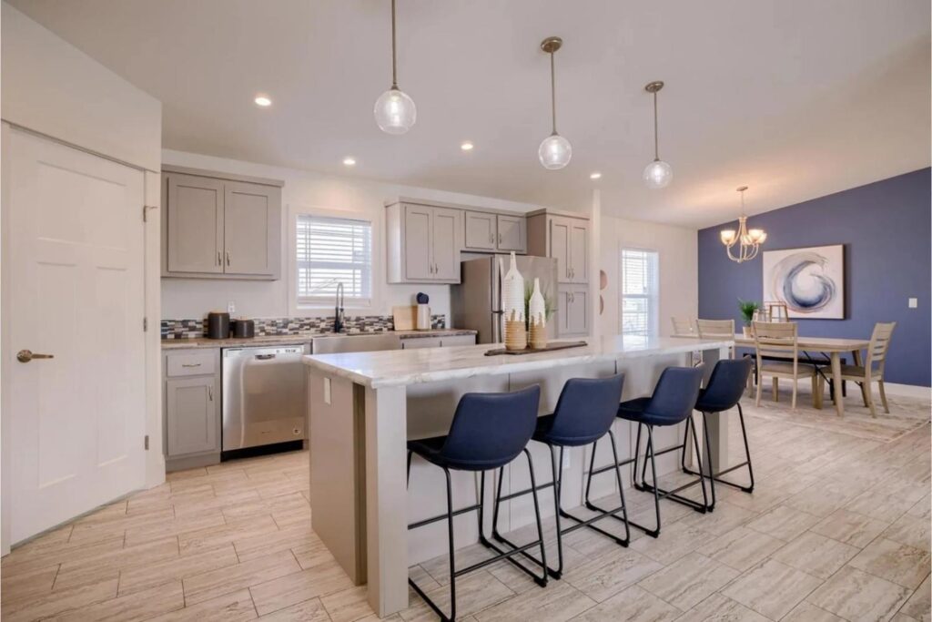 Image URL: https://yourbesthomeprice.com/wp-content/uploads/2025/10/Prairie-Dune-83122.webp Image File Name: Farmhouse kitchen and living Image Alt Text: A living room with rustic flooring, gray